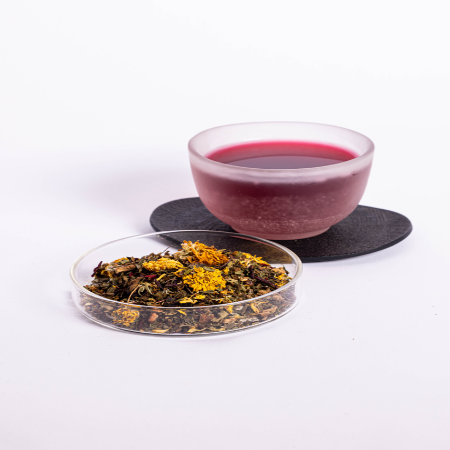 Ingredients: Chrysanthemum, saffron, cardamom, hibiscus, mint, tulsi, sarsaparilla, raspberry leaf, flowers, lemon & peach flavor