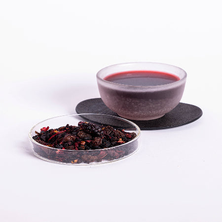 Black berries, red berries, grapes, sour cherry, hibiscus, flavor.
