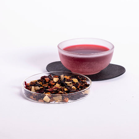 Pineapple cubes, apple cubes, hibiscus blossoms, rose hip peel, orange peel, coconut flakes, freeze-dried sour cherries, flavoring.