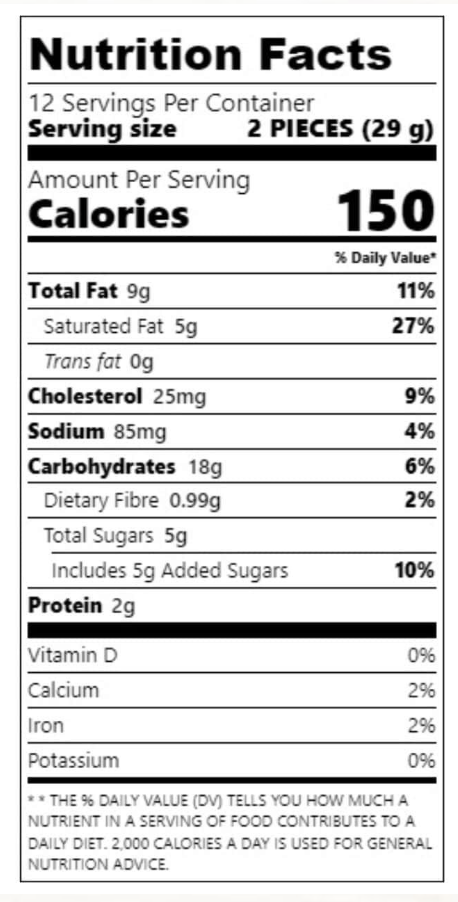 Ingredients: Wheat flour (wheat flour, calcium carbonate, iron, niacin, thiamin), butter (milk) (32%), sugar, salt