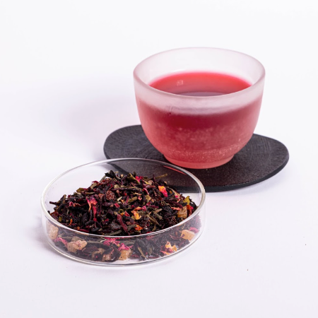- Rose hips, pineapple flavor, papaya flavor, and red rose petals for a floral-fruity balance.